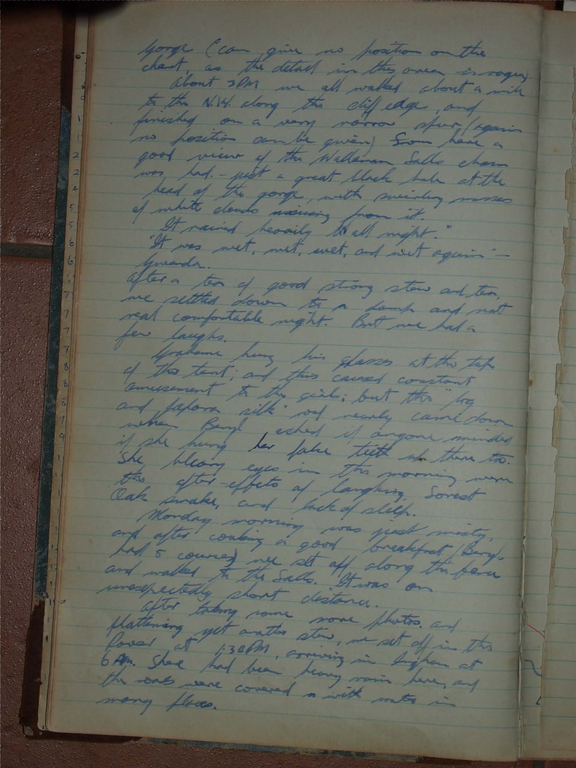 Grahame hung his glasses at the top of the tent; and this caused constant amusement to the girls; but the "frog from silk" was not nearly calmed down when Beryl asked if anyone minded if she hung her false 'teeth' up there too. The bleary eyes in the morning were the after effects of laughing, sore & weak muscles, and lack of sleep.