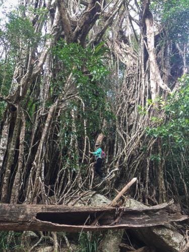 More waterfalls and nice pools along the way, at every pool some ask “is this the black hole?” – the answer is always no. Another blockage and another bushbash through nasty pandanus. For those wearing shorts, means cut lugs ! Pass the large giant strangler fig, an imposing beast.