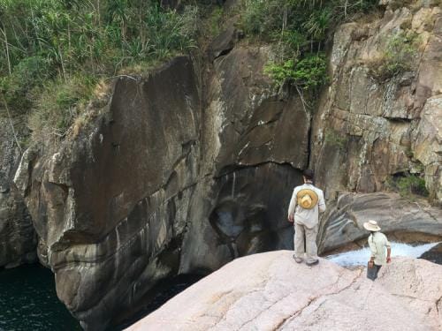 2015 was the last time we did this walk – time to do it again. 10 walkers (4 members, 6 visitors) assembled at Jourama Falls, we started walking at 0180. The steep climb up the trail to top of the ridgeline above Jourama Falls, gets the heart pumping first thing in the day. Quick stop at lookout rock, then along the trail to descend into Waterview Creek above the main Jourama waterfall. We keep going upstream, rock hop along the creek. 0940 we arrive at a waterfall and blockage (the old club lunch spot on some walks) a good morning tea spot. 1005 we move on, go bush to get around this blockage, into spiky panadanus which threatens to cut and tear the unwary – well the leader at last. Those down the back get a nice clear path. Decide to drop down a steep bit to above the waterfall, which is a nice spot. But we are blocked by a higher waterfall, so have to climb out the same way. Damned leader (scenic view he said) !