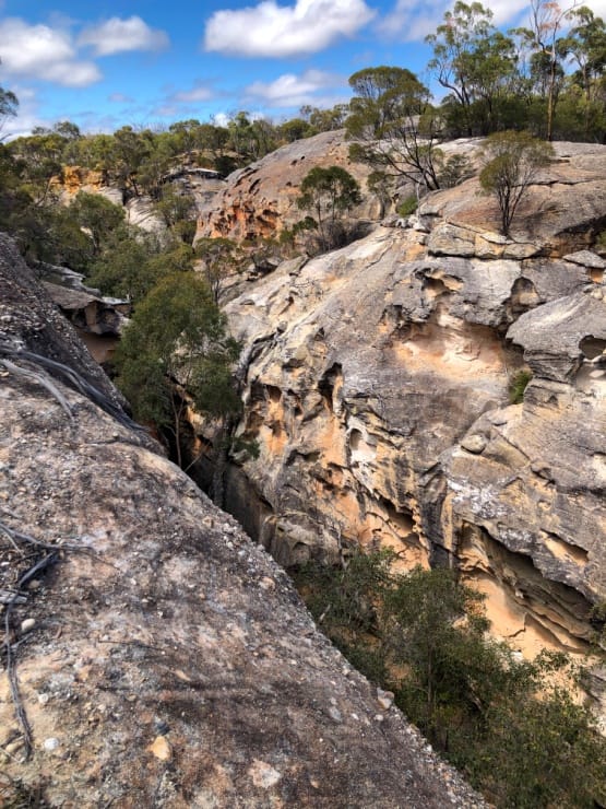 Friday – the drive to Canns Creek section, start with afternoon explore of Sawpit Gorge area. On the drive in, a quick detour to Sawpit Creek Gully lookout, which has bushwalking potential. Future idea is a day hike to explore the two Sawpit Creek Gullies as a loop walk. But today, we do a drive around the Sawpit Gorge rim to find areas of interest there – a colourful drive with dense yellow wattle and flora of other vibrant colours (e.g. purple, red). We stop to look at a sandstone outcrop – we are well dressed, in thongs and comfortable driving clothes – not going far. RIGHT ! So standing on edge of the sandstone outcrop, a scrubby gully below, an interesting sandstone pinnacle the other side – yeah, you guessed it, we just had to clamber down in scrub into the gully, and around the base of the sandstone outcrop which was worth it for lovely white sandstone eroded features. There were many calls of “why are we wearing thongs in this crap?’ - I got the blame for that. Up the other side, then back on the rim to the cars. Drive a short distance back to Sawpit Gorge Lookout, put on proper footwear and clothes, and go for a short but spectacular hike in this gorge. The girls saw a crevasse and just had to get into it. Sign of what was to come. Then a short drive to the campsite and refreshments.